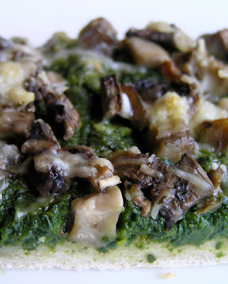 I've been experimenting with pizza toppings again. This combination includes a green sauce of pureed spinach, garlic, red pepper flakes, and olive oil, with mushrooms (and more garlic) and parmesan cheese on top.