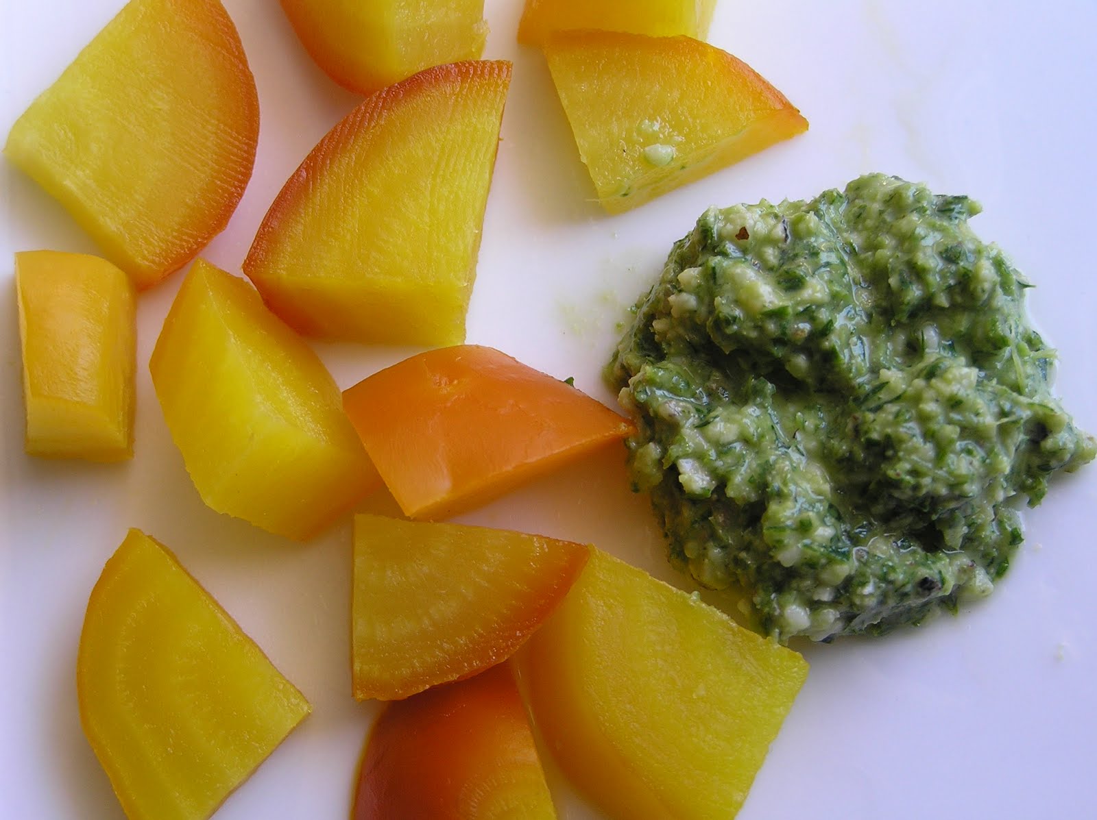 Cut beets in small pieces and serve with parsley pesto (recipe below).